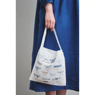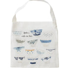 A mini bag featuring illustrations by Isabelle Boinot. Various cafe au lait bowls in shades of blue are printed with a soft watercolor touch, showcasing beautiful patterns. Its compact size and single handle make it easy to carry, perfect for a casual outing or a quick trip.