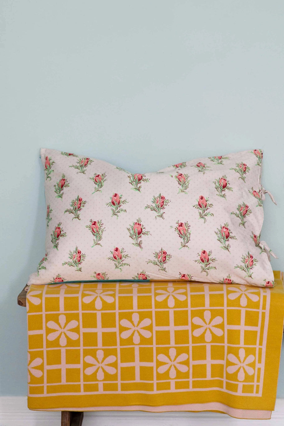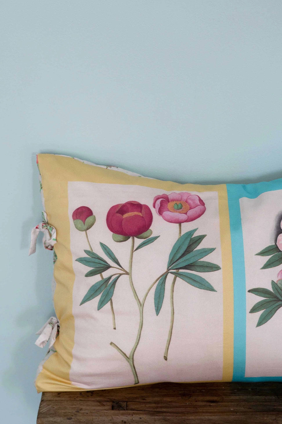 This reversible pillowcase set features two beautiful paintings of peonies by Flemish humanist, naturalist & gemologist Anselmus Boetius de Boodt (1550 - 1632) on backgrounds of mustard yellow and deep aqua blue with Rosebuds vintage wallpaper print on the reverse side of the pillowcase. Perfect to mix and match by using either side.
