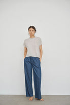Made from GOTS certified cotton denim, these pants feature a slightly loose and comfortable fit, a soft elastic waistband with ties, and practical side pockets. The perfect match for your favourite tops and sweaters.