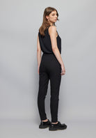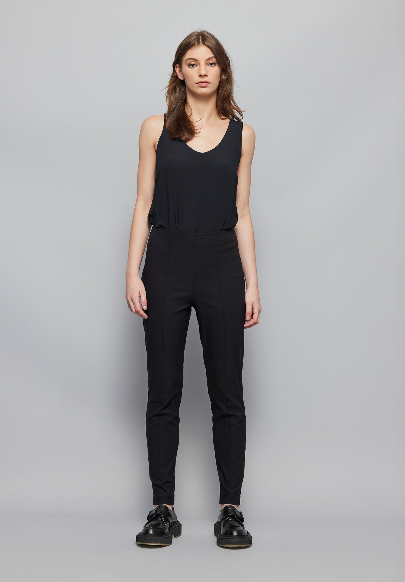 This mid waisted trouser is a slim cigarette leg fit. A subtle pintuck stitch creates interest on the centre front leg. Executed in a mid weight fabric with excellent stretch and return, there is no requirement for zippers or other openings.