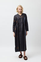 A relaxed fit, longish dress with a v-neck and back bodice buttons. It has a bracelet length slim sleeve and an in-seam side pocket. A simple and elegant shape designed to show off this extraordinary textile.