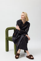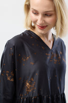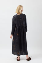 A premium cotton sateen screen print by Naomi Ito Japan. This print is called Cosmos and so too is the dress. Whimsical brush stroke artworks that reflect shapes from the natural world in shades of copper on chocolate brown. It really is a very special fabric.