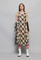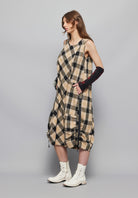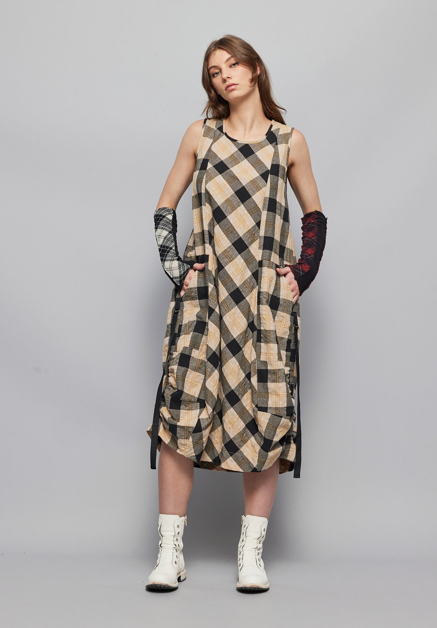 Self-casings stitched to the side seams enclose herringbone tape drawcords, which can be used to ruche and gather the dress to create multiple volume proportions.