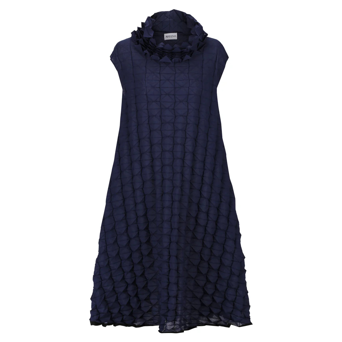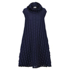 Architectural and artful, the Fresco Dress is defined by its sculptural silhouette and intricate texture. Crafted from 100% Japanese yarn, it features a geometric shibori style pleating. The fold-over turtleneck adds structure and drama, balanced by soft cap sleeves and a flowing A-line shape that falls to midi length. Both modern and timeless, the Fresco Dress is a testament to form, movement, and meticulous craft.