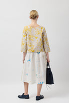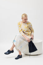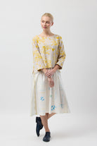 Two rare Japanese fabrics are featured in this dress. The cotton print for the skirt is by Yoshiko Jinzenzi and features random geometric and organic colour pattern placement and gentle words. The top is made from a needle corduroy by Naomi Ito with a botanical screen print of leafy shadows.