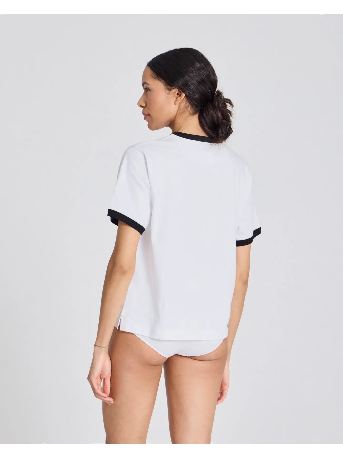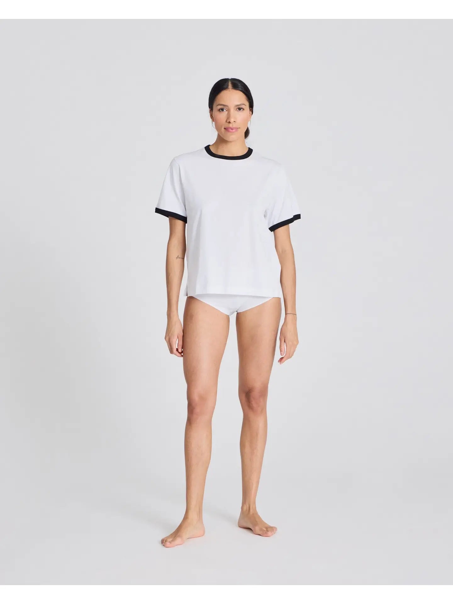 Sandy is a short-sleeved tee shirt, made from 100% organic cotton. The tee shirt features a round neckline with a contrasting black ribbed edge, low shoulder seam, and side slits. The sleeves also have a black contrasting ribbed edge. Sandy has a straight, relaxed fit. Sandy is GOTS certified.