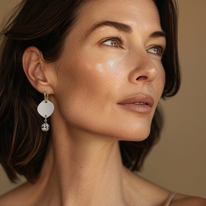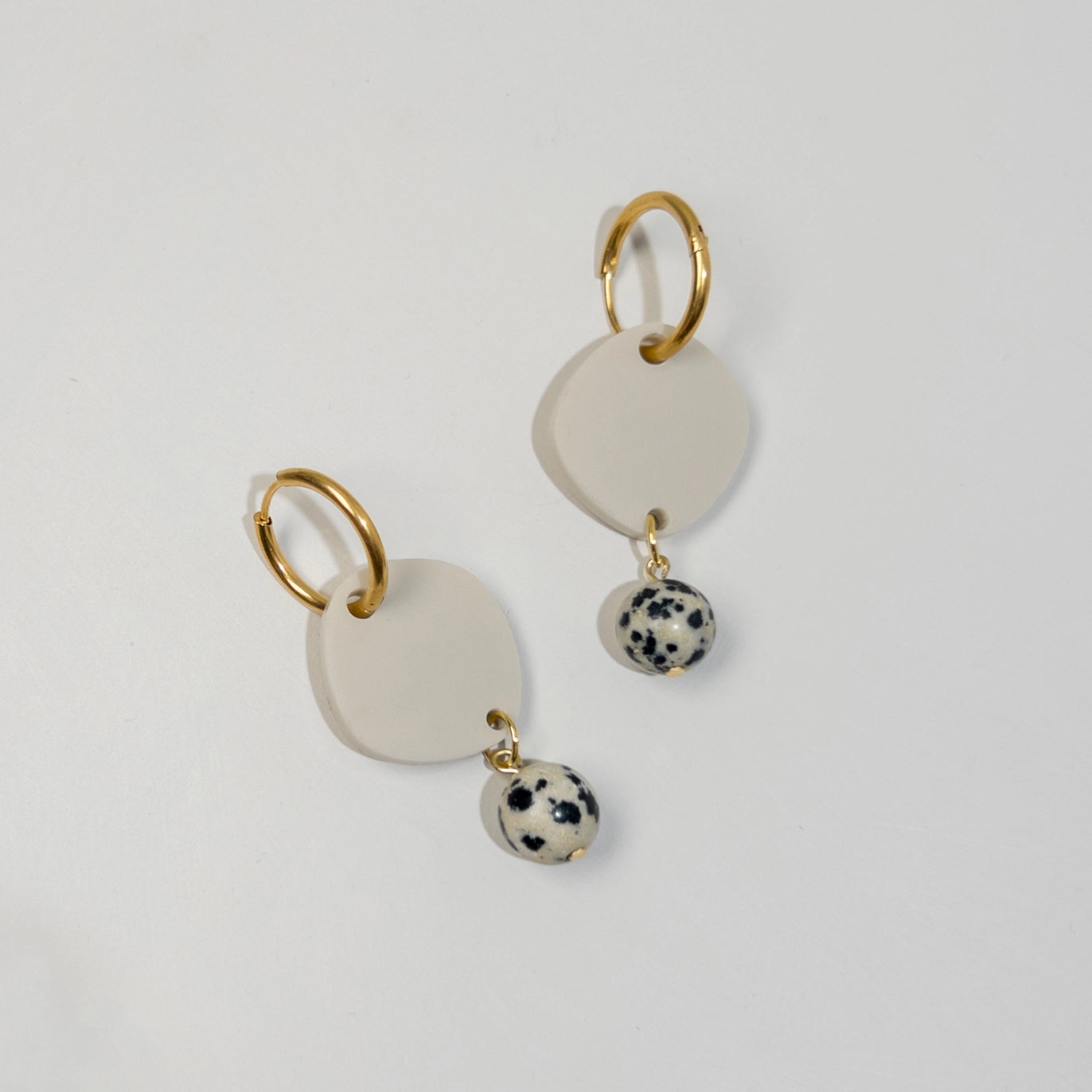 The Haven Huggie Dangle features a huggie style hoop, organic shaped dangle and finished with a dalmation jasper stone bead. Lightweight and hypoallergenic, Haven is designed for comfort without compromising on style, seamlessly complementing your wardrobe with understated charm.