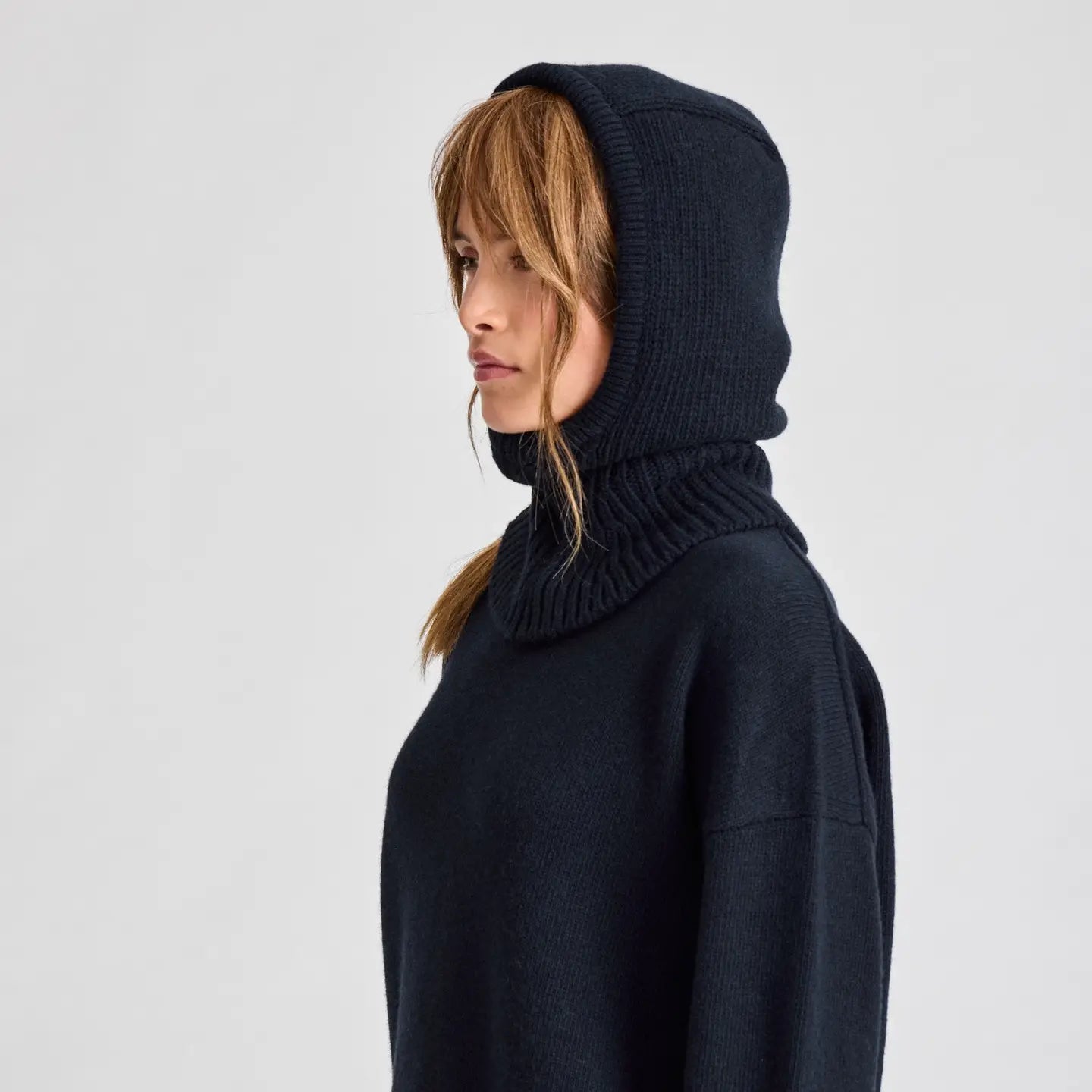 This stylish balaclava is essentially a knitted hood made of 100% lambswool. It makes for a great coordinate with chunky and light layers alike.
