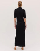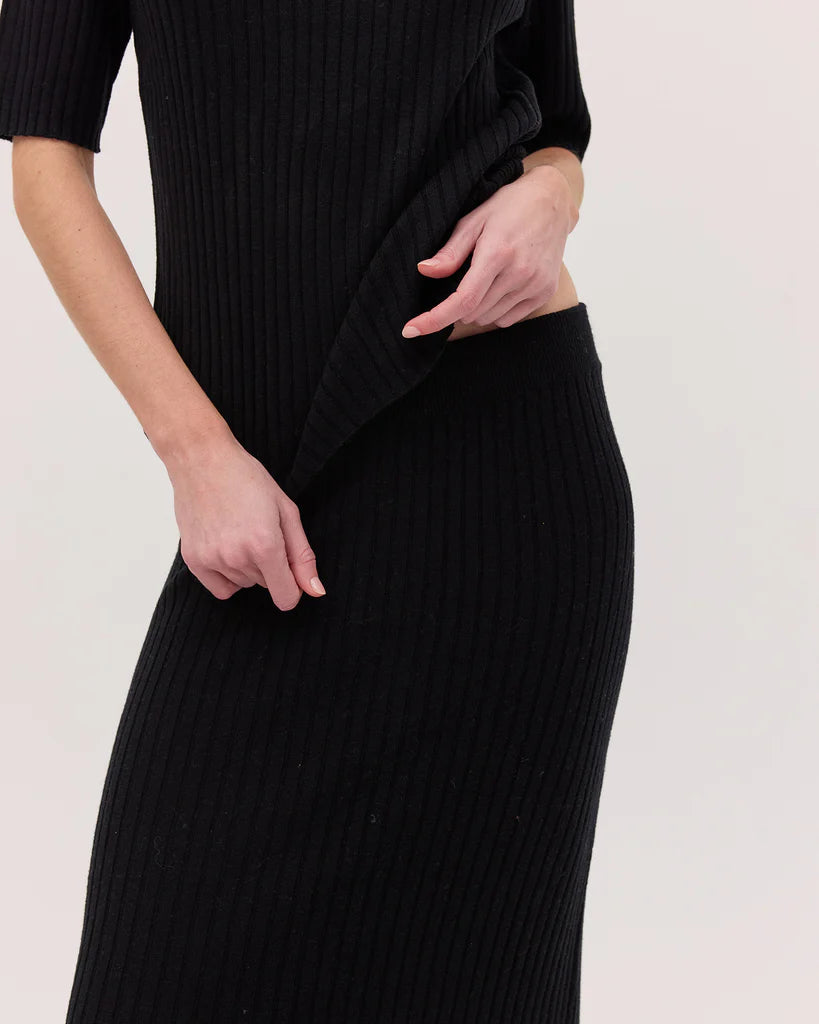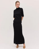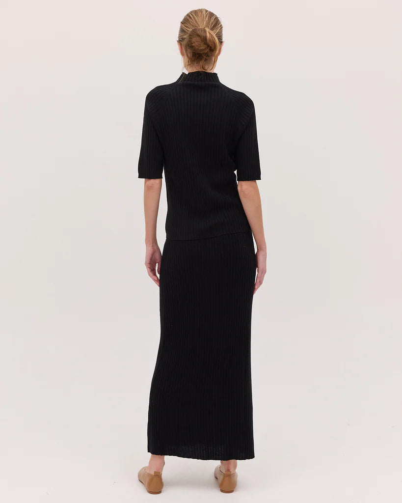 Made from a blend of 45% RWS merino wool and 55% organic cotton, this long-length rib knit skirt features a comfortable elastic waistband. Its soft, stretchy fabric creates a flattering fit, offering both elegance and ease for a versatile addition to your wardrobe.