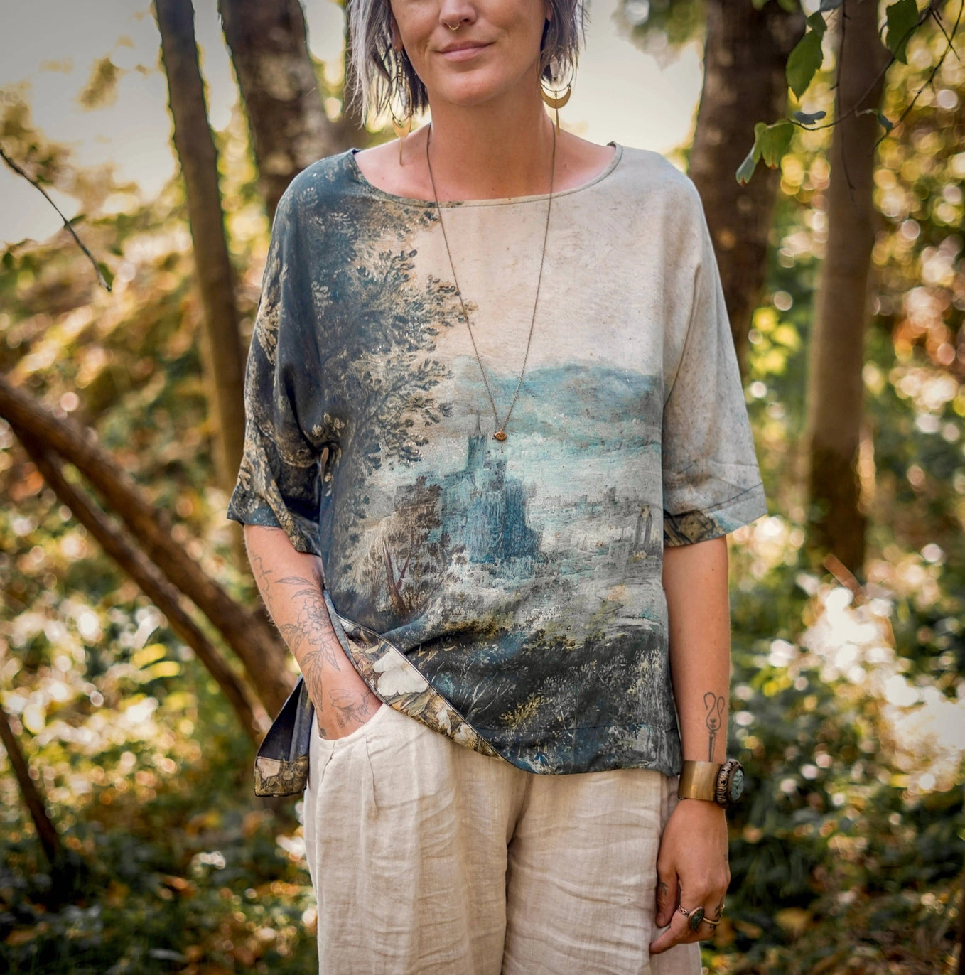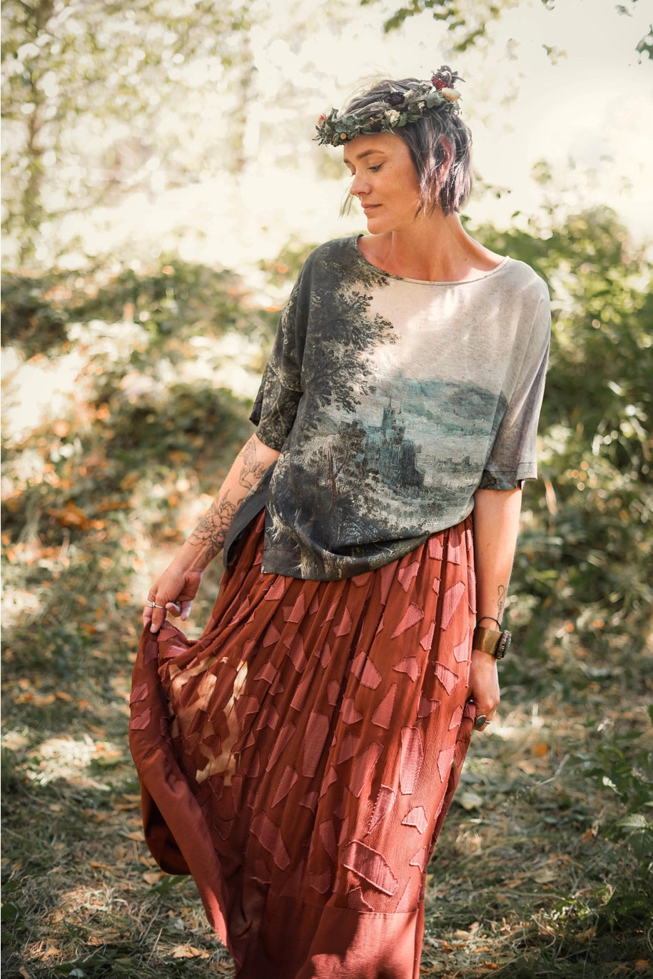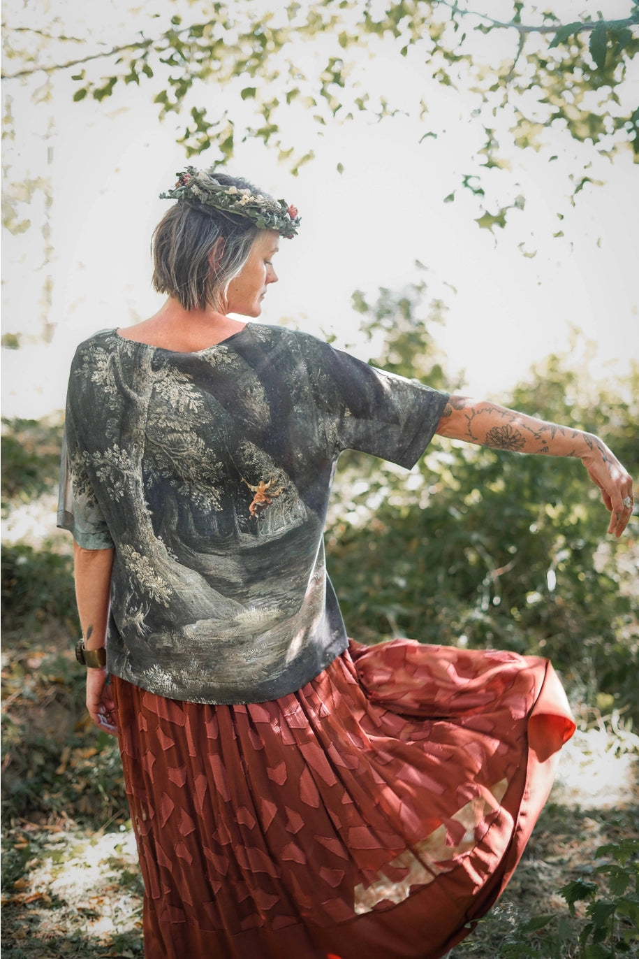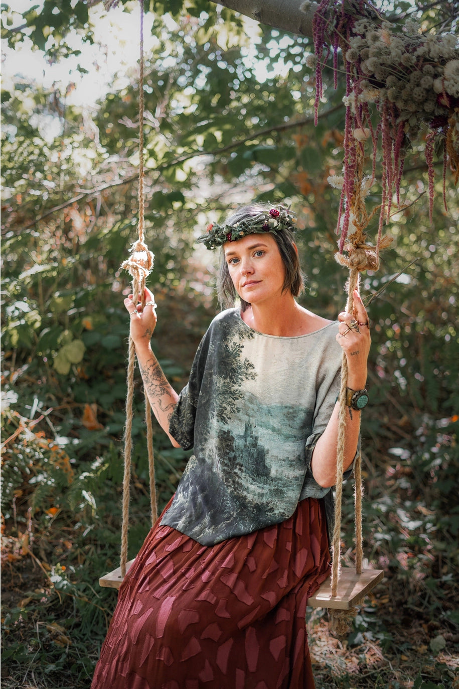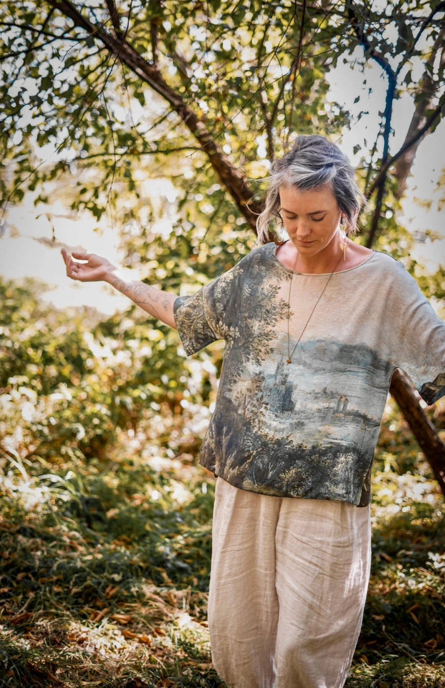 Meet the Luxe Tee. a wardrobe staple, the humble t-shirt has been elevated to a chic, easy wearing piece with an oversized cut that’s destined to become a style you’ll reach for over and over. Based on a lush and magical painting from the 1600’s by artist Jan Brueghel titled “Imaginary Landscape”, this top is a true flight of fancy! Using Brueghel’s masterpiece, elements were layered from French artist Hubert Robert, including the classical ruins and a girl swinging joyfully through the trees. The resulting piece is full of imagination and depth, just like a beautiful dream