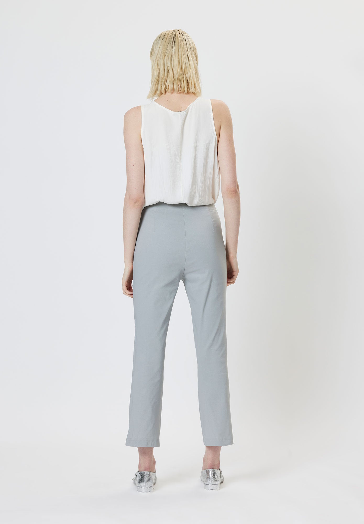 This mid waisted trouser is a slim fit, with a gentle flared shape extending from the knee to the hem. A subtle pintuck stitch creates interest on the centre front leg. Executed in a mid weight fabric with excellent stretch and return, there is no requirement for zippers or other openings.