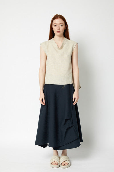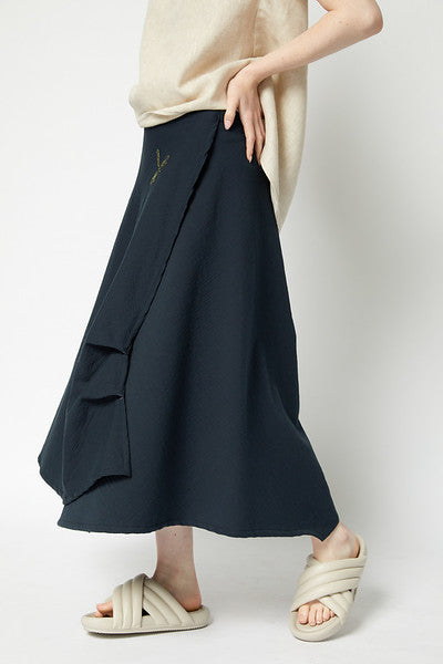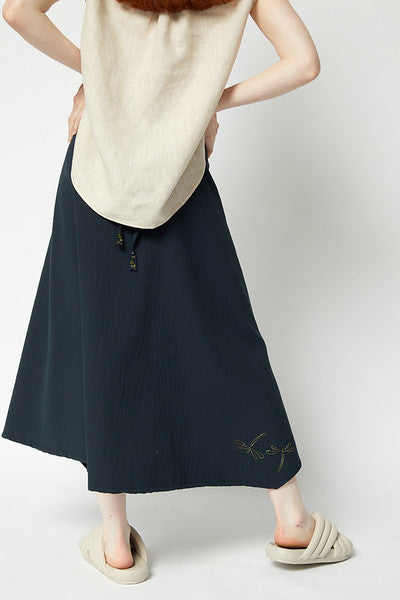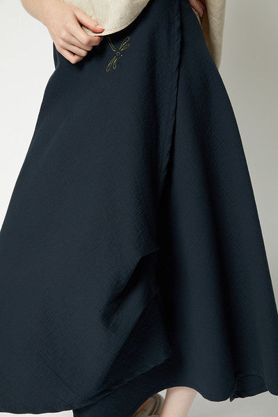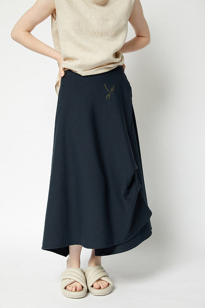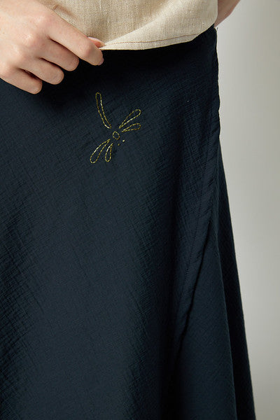 A simple wrap skirt with an angular hem in extraordinary fabric which brings a unique architecture to its silhouette. Sashiko stitched dragonflies in variegated earthy green threads have been added to the hem and waist for the most charming and hand crafted decorative detail.