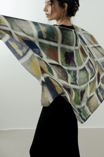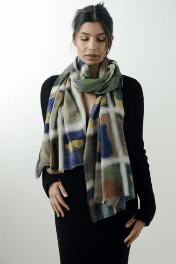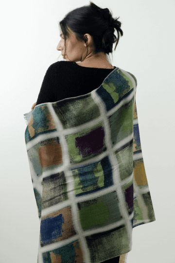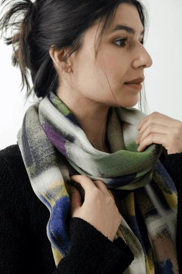 The Lina scarf showcases a stylish checkered pattern in shades of green, gray, purple, and blue. Crafted with 92% Australian Merino wool and 8% silk, this accessory exudes luxury.