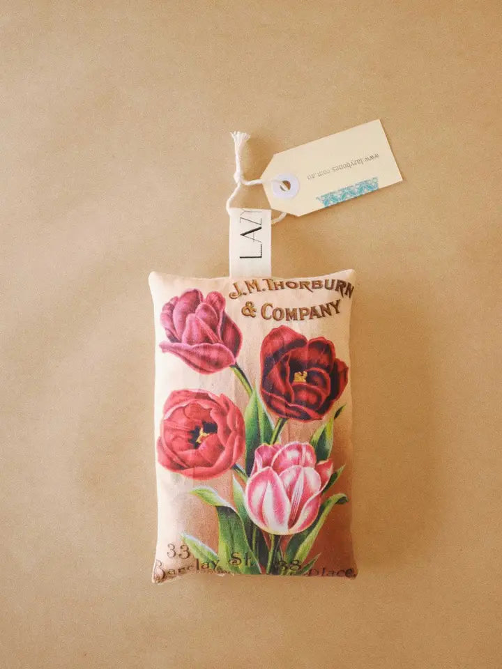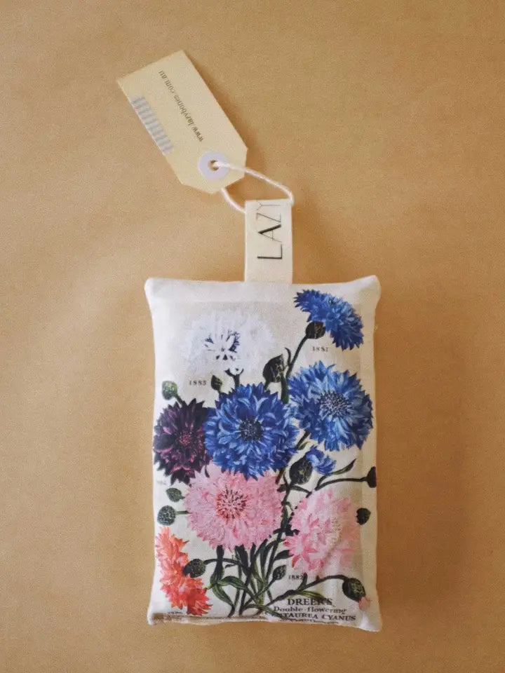 Scented drawer sachets from Lazybones featuring vintage and botanical prints on organic cotton. The back is unbleached calico. Keep your wardrobe smelling delightful.