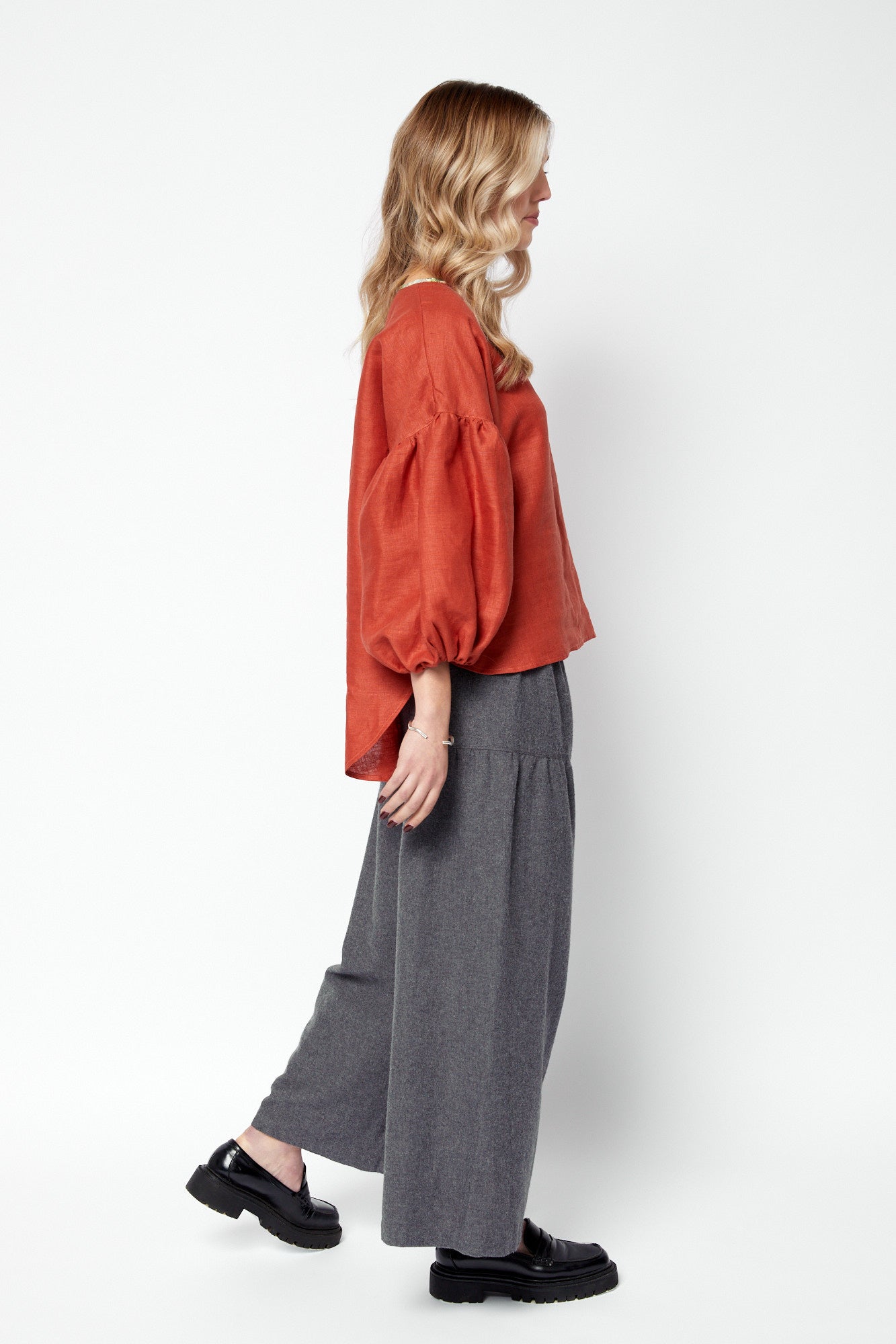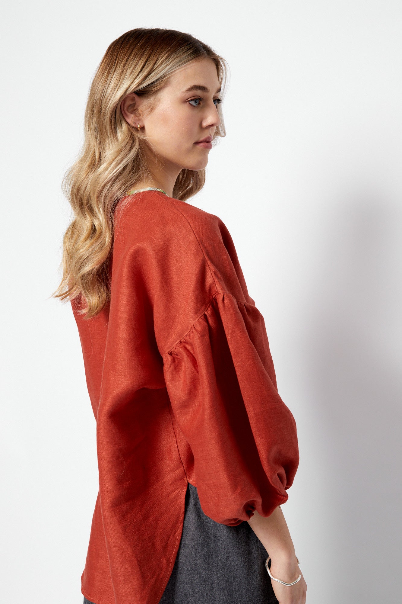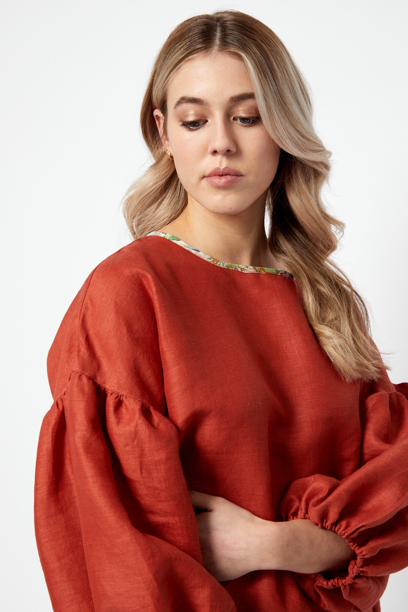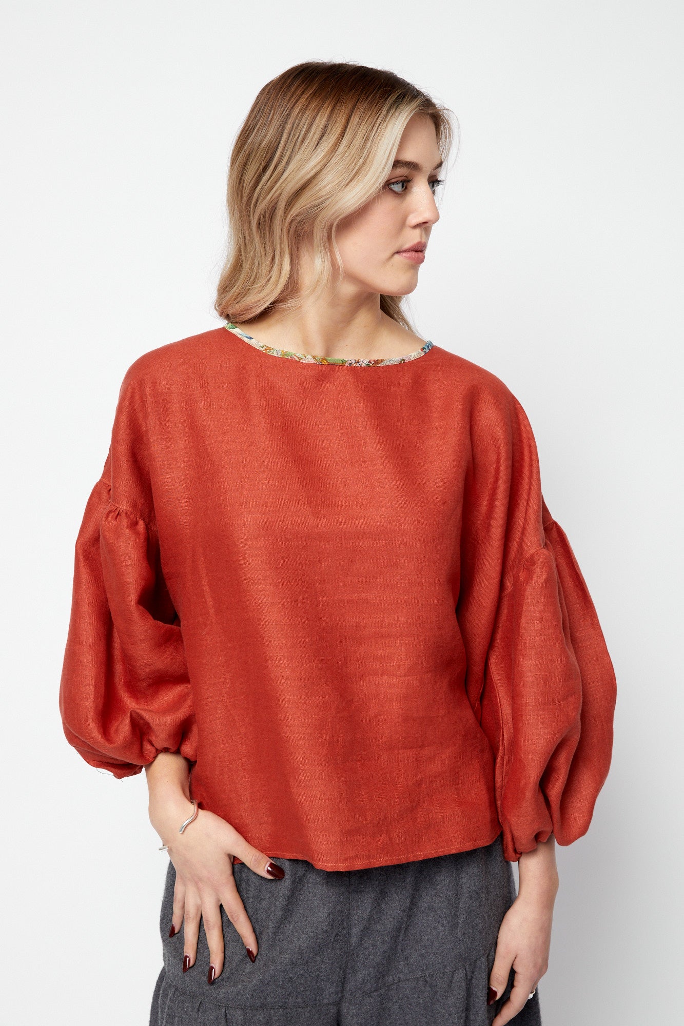 Bloom is a beautiful feminine top that I recently designed and brought to life. Round neckline with contrast bias edge finish, dropped shoulder seam meets a gathered sleeve sitting at 3/4 length with loose elastic cuffs. The hem is stepped and scoops with a lovely curve longer to the back.