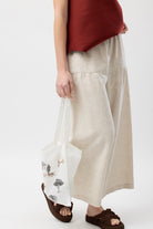 Soft fitting elastic waist pants with gathering shared between waist and yoke. Ideal for the layered wardrobe.