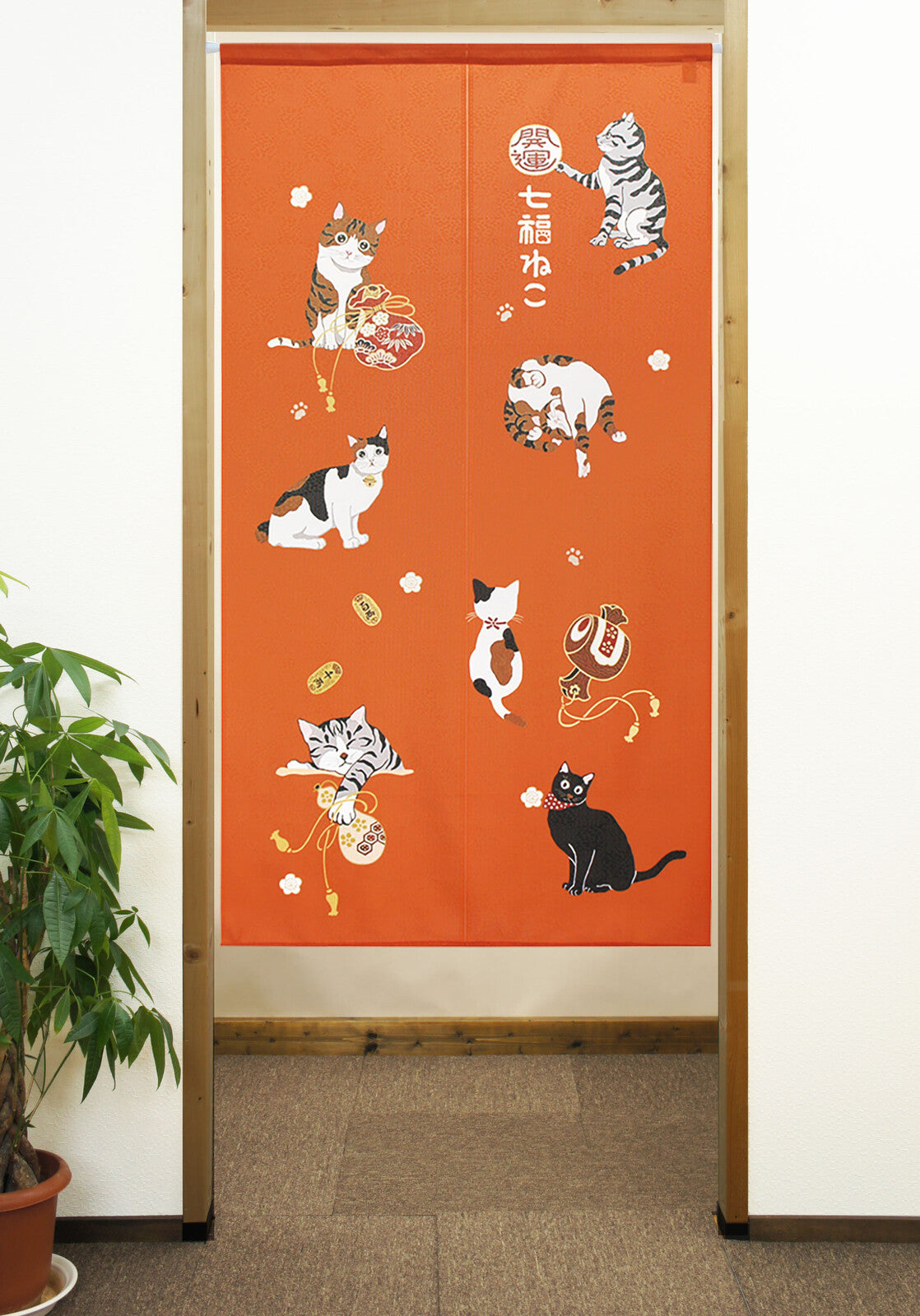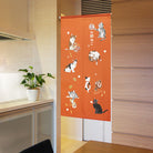 The beckoning cat is hiding, playing and showing off in this joyful joyful Japanese Noren