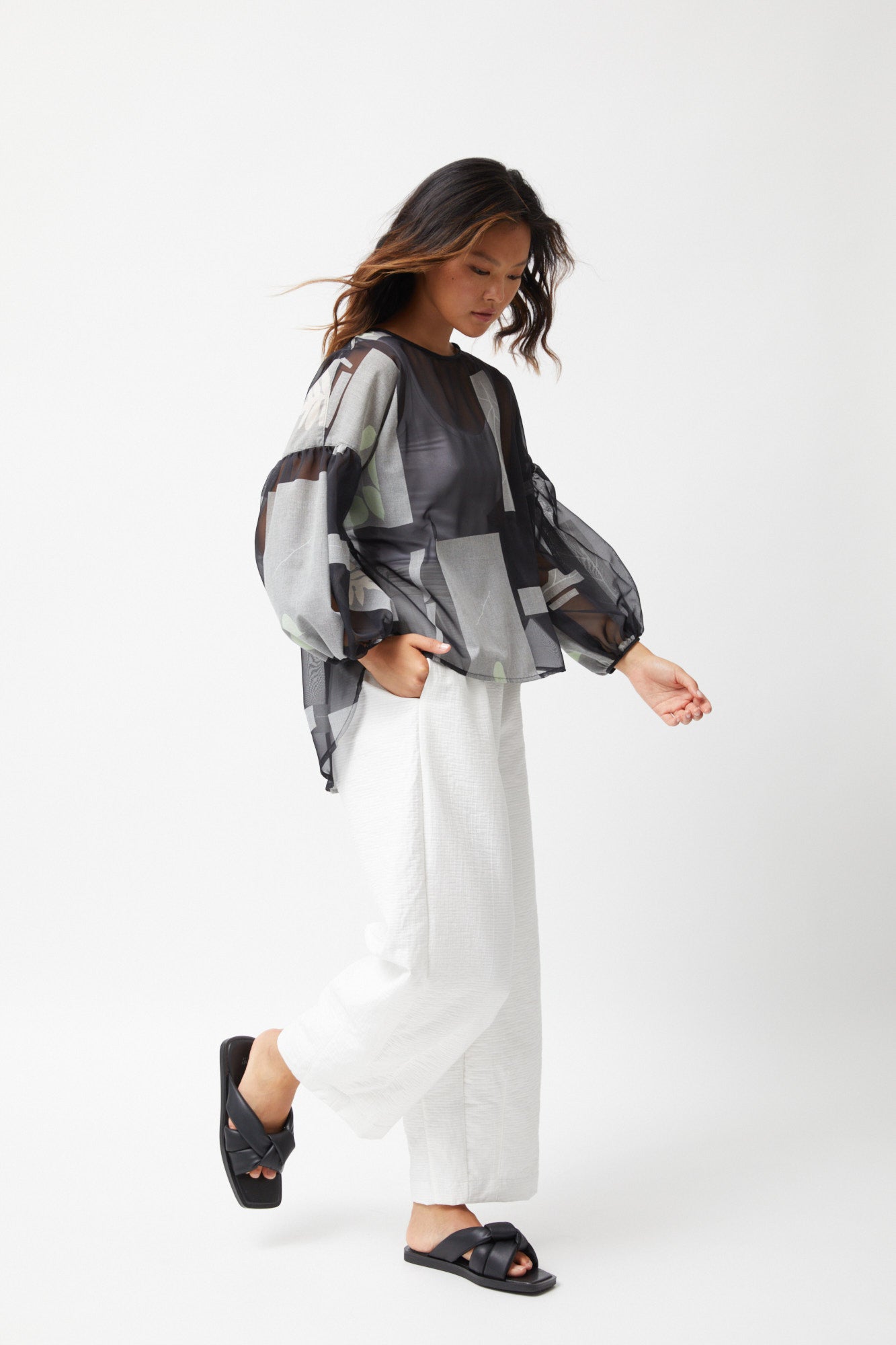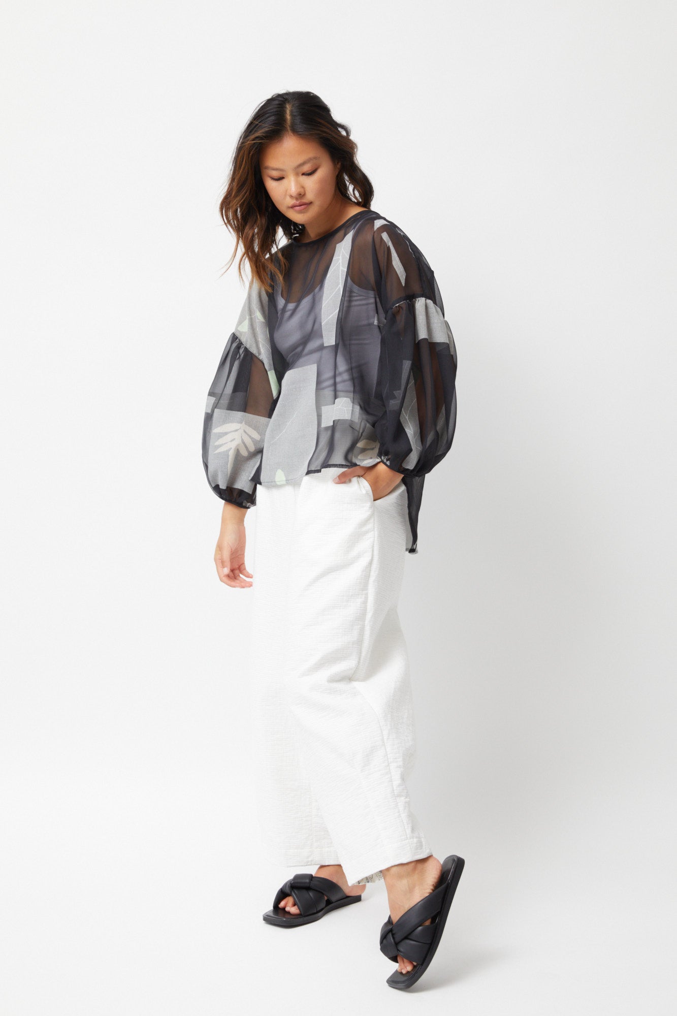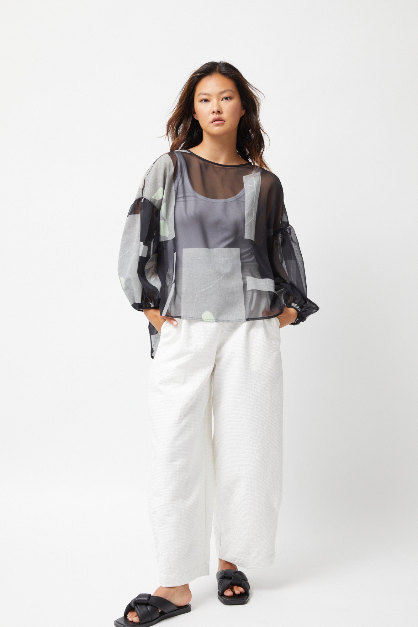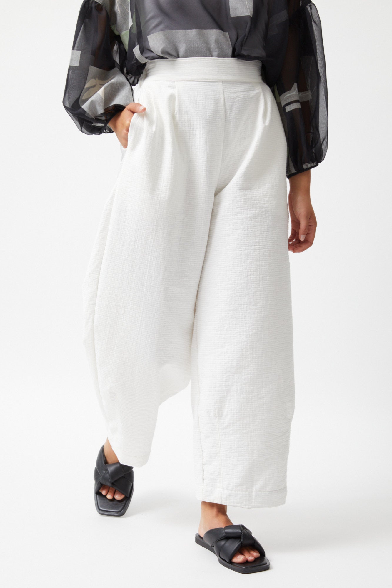 Luxurious and practical, these Tapered Pants are crafted with air cotton from Japan for a soft and comfortable feel. With a tailored front waist and elastic back waist you are assured of a flattering and forgiving fit. Complete with side pockets, these pants are a stylish and functional addition to your wardrobe. Available in winter white.