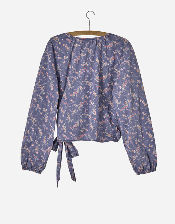 Wrap blouse in authentic Liberty design printed on organic cotton. Wide sleeves with elastic band at cuffs, gatherings at back neck, and long tie bands at the waist.